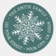 Winter holiday return address rubber label featuring a white, whimsical, folk art style snowflake and your name and address on a pine green background. All colours are customisable.