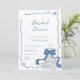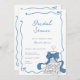 The AMRIN whimsical something blue bridal shower invitation features whimsical design with a hand drawn ribbon border and a champagne tower with a big blue bow and ribbons, paired with handwritten and serif fonts in a matching shade of blue and dark grey to add visual interest to your blue bridal shower invites. This hand drawn wedding shower invite sets the tone for your playful something blue bridal shower.
