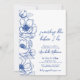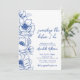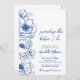 The shower details are elegantly presented on the right in a mix of handwritten-style script and classic serif fonts, all in matching blue, creating a cohesive and sophisticated look. Perfect for spring and summer bridal showers, the floral illustrations add a fresh and timeless touch to the design.