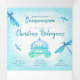 Beautiful 3-panel Quinceañera invitation with turquoise and aquamarine artwork has dragonflies, carriages, and a tiara to dazzle your photos. Easily resize and reposition dragonflies and text. A glitter #15 on front of this whimsical quince card is as fancy as the gemstone silver tiara and glitter polka dots. Each panel of this trifold style Quinceanera birthday invitation is elegant and unique.