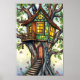 Whimsical wall art print features an illustration of a treehouse with stained glass walls. Graphic designed with AI-assist software.