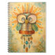 A whimsical steampunk-inspired owl crafted from repurposed tin cans, metal gears, and colorful embellishments forms the centerpiece of this vibrant mixed media design. Floral patterns, jewel-toned feathers, and radiant orange sunbursts radiate in the background, creating a charming fusion of folk art and industrial whimsy.