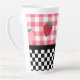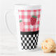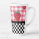 Whimsical Spring / Summer themed mug features top half of red and pink strawberries on pink gingham and bottom half of black and white chequerboard.