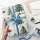 Colourful wrapping paper showcases charming cars alongside beautifully decorated Christmas trees with vibrant bows, evoking a cheerful winter spirit for holiday gift-giving.
