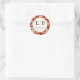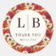 This wedding sticker features a charming circular design with a vibrant floral pattern in shades of red, orange, cream, and brown. The central circle showcases bold, uppercase initials "L" and "B," surrounded by the phrase "THANK YOU" in elegant serif typography. The whimsical and romantic style is enhanced by stylized flowers that create a lively and inviting atmosphere, perfect for expressing gratitude at weddings or special celebrations. The seamless tiling effect of the floral background emphasizes abundance and continuity, making it an ideal choice for those looking to add a touch of natural beauty and elegance to their event decor.