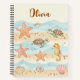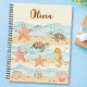 This personalised notebook features adorable baby sea creatures—starfish, turtles, and seahorses—set against gentle wave patterns and a soft sandy background. This playful design has soothing pastel blues, warm sandy tones, and coral accents.