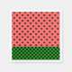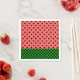 Whimsical napkin features watermelon pink and black hearts pattern with dark green chequerboard bottom border.