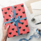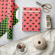 Whimsical wrapping paper features watermelon pink and black hearts pattern with dark green chequerboard bottom border.