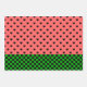 Whimsical wrapping paper sheet pattern features watermelon pink and black hearts pattern with dark green chequerboard bottom border.