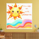 Retro Groovy Wave Wall Art. The design showcases a friendly smiling sun rising over a series of colorful, flowing rainbow waves in a whimsical hand-drawn style.