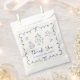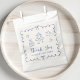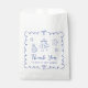 Cute light cream favour bags for your baby boy shower featuring a french blue wavy frame adorned with bows, whimsical hand-drawn illustrations of hearts, stars, cake and nursery decor, and "Thank You" showcased in a fun, playful blue script.