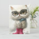 This charming card features an illustration of a whimsical cat with exaggerated, endearing features. The cat has large, expressive yellow eyes behind round black glasses, giving it a studious yet adorable look. Its fluffy white fur adds to its soft and loveable appearance. The cat is dressed in a light blue bow tie and bright pink boots, adding a touch of dapper sophistication and playful quirkiness. Small cotton-like balls scattered around its feet suggest a recent playful activity, enhancing the overall whimsical feel.