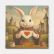 Fall in love with this charming and unique take on the White Rabbit from Alice in Wonderland! This delightful illustration portrays a cute, anthropomorphic white rabbit seated at a rustic table, holding a heart-adorned invitation or card. Dressed in a whimsical red and green outfit, he's ready for a tea party in an enchanting landscape dotted with fairytale castles, colourful banners, and blooming flowers. Teacups and a cake complete this sweet and imaginative scene, perfect for fans of Alice in Wonderland and anyone who adores whimsical, heart-filled art.
