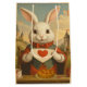 Fall in love with this charming and unique take on the White Rabbit from Alice in Wonderland! This delightful illustration portrays a cute, anthropomorphic white rabbit seated at a rustic table, holding a heart-adorned invitation or card. Dressed in a whimsical red and green outfit, he's ready for a tea party in an enchanting landscape dotted with fairytale castles, colourful banners, and blooming flowers. Teacups and a cake complete this sweet and imaginative scene, perfect for fans of Alice in Wonderland and anyone who adores whimsical, heart-filled art.
