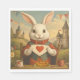 Fall in love with this charming and unique take on the White Rabbit from Alice in Wonderland! This delightful illustration portrays a cute, anthropomorphic white rabbit seated at a rustic table, holding a heart-adorned invitation or card. Dressed in a whimsical red and green outfit, he's ready for a tea party in an enchanting landscape dotted with fairytale castles, colourful banners, and blooming flowers. Teacups and a cake complete this sweet and imaginative scene, perfect for fans of Alice in Wonderland and anyone who adores whimsical, heart-filled art.