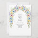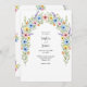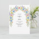 Beautiful wedding invitation card background featuring a clean white backdrop and a watercolor wildflower arch border in pastel blue, purple, pink, yellow and orange tones. Perfect for print on demand wedding stationery.