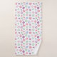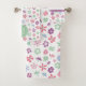 A modern whimsical floral patterned bath towel set. This delightful ensemble features a lively combination of blue, green, pink, and purple hued flowers, creating a refreshing and inviting atmosphere that instantly brightens up your space. Insert a monogram on the washcloth and hand towel.