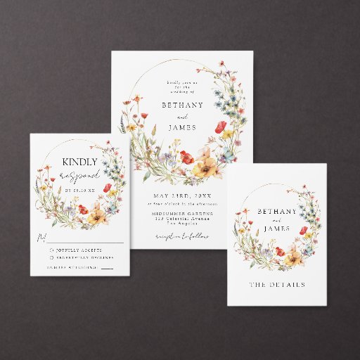This elegant wedding invitation features a delicate wreath of rustic watercolor wildflowers surrounding the bride and groom's names. Perfect for whimsical spring and summer weddings.