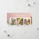 This Christmas card design showcases a whimsical winter scene featuring three pink houses covered in snow. The houses, with golden doors and windows, are surrounded by snow-laden trees and pinecones, creating a festive and cosy atmosphere. The soft pink background with falling white snowflakes adds a touch of charm and warmth to the card. The front of the card includes three placeholders for uploading personal family photos, allowing you to add a personal touch to your holiday greetings. The inscription "Merry Christmas" is elegantly displayed, enhancing the festive feel of the card.