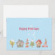 Whimsical watercolor winter "street" scene features cottages, snow covered trees, and a car with presents stacked high on top. All on a light blue background with magical snow spiral. Customisable "Happy Holidays" text in modern font
