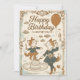 This vintage-inspired birthday card features two charming anthropomorphic foxes celebrating joyfully in a whimsical woodland setting. Rendered in a sepia and sky-blue palette on textured aged paper, the design showcases intricate decorative borders, floral flourishes, and fantasy elements such as smiling suns, floating clouds, and delicate scrollwork. The playful scene includes a tiered cake, a balloon, and joyful expressions, all under the bold and beautifully hand-lettered "Happy Birthday" greeting. The illustration blends nostalgic fairytale aesthetics with a soft, heartwarming mood, perfect for evoking childhood magic and timeless celebration.