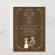 This charming wedding invitation collection features a well-dressed fox couple surrounded by a garland of hand-drawn leaves in a rustic wreath arrangement.