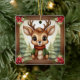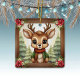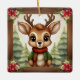 Whimsical Xmas Reindeer Holiday Decoration, rustic square ceramic ornament featuring a brown wooden frame, with Christmas poinsettia flowers and a cute baby forest animal, unique deer with antlers in a cartoon graphic art style wearing a jacket and scarf, standing in the foreground. Wintry trees, complete the winter season charm of this woodland wildlife doe character illustration, making for a great gift. Fawn lover design is on front and back. So no matter how the hanging decor turns, it always looks festive and complete. Get yours today!