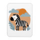 Whimsical animal art illustration of a zebra, in a modern Scandinavian influenced style, with bold flat colours and simple rounded shapes, gives a playful mid-century modern influence, a hand-drawn charm, with minimal detail. A soft pastel background, makes a friendly and cheerful design.