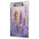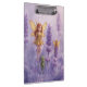 Among blooming lavender fields, three magical beings gather — a golden-winged fairy, a playful sprite, and a leafy companion.