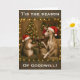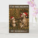If you own or love a Whippet or are a dog lover I'm sure you'll know the penchant that Whippets have for squirrels! Our Whippet goes from zero to 100 if he sees or gets wind of one. Here they are toasting their Christmas truce in this Christmas holiday greetings card. The Whippet dog and the squirrel are both sitting in armchairs opposite one another with a glass of red wine which they're making a toast to one another with. A Christmas tree is behind them with twinkling light. The background of the card is a lovely brown tweed fabric effect.