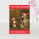 If you own or love a Whippet or are a dog lover I'm sure you'll know the penchant that Whippets have for squirrels! Our Whippet goes from zero to 100 if he sees or gets wind of one. Here they are toasting their Christmas truce in this Christmas holiday greetings card. The Whippet dog and the squirrel are both sitting in armchairs opposite one another with a glass of red wine which they're making a toast to one another with. A Christmas tree is behind them with twinkling light.