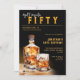 The invitation features a prominent "Aged to Perfection" headline, immediately establishing the theme and celebrating the milestone birthday. The word "FIFTY" is displayed in a large, bold font, making it the focal point of the design. A captivating watercolor-style illustration of a bottle of bourbon and a filled glass with ice takes centre stage, evoking the rich amber hues and inviting aroma of fine whiskey. The event details, including the date, time , honoree's name and venue are presented in a clear and legible font, reminiscent of classic magazine layouts. The RSVP information is also clearly displayed.