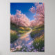 Experience the tranquillity of "Whispering Waters," as a charming stream gracefully meanders through a lush green field, embraced by blooming cherry trees on both banks. Allow the soothing sound of flowing water and the gentle rustle of leaves to envelop you in a serene ambiance. Immerse yourself in this idyllic setting, where nature's beauty and peacefulness harmoniously converge.