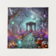 Under the watchful glow of a full moon, a vine-draped archway beckons through a cobblestone path lined with flickering candles and carved jack-o'-lanterns. Ethereal ghosts drift silently near ancient tombstones, their presence illuminated by floating orbs in hues of green, blue, and violet. Bats wheel through the twilight sky as purple blooms and autumnal foliage weave a tapestry of enchantment along the trail. This spectral garden pulses with quiet magic—where every shadow holds a secret and every light feels like a memory reborn.