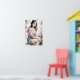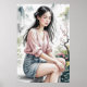 This wall art portrays a serene young woman seated gracefully in a tranquil garden scene. Dressed in a soft pink blouse and denim skirt, she exudes an air of quiet contemplation. Her long, flowing black hair catches a gentle breeze, while delicate blossoms bloom beside her, adding splashes of soft pink to the peaceful setting. The misty, watercolor-like background of mountains and foliage enhances the dreamlike atmosphere, making this piece a perfect blend of elegance, nature, and calm reflection.