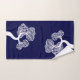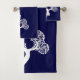 White abstract circle tree and name on navy blue bath towels set. This lovely, design displays a white abstract tree with circles instead of leaves on all three pieces on blue background and a frame with name on the wash cloth. You can remove the name if desired.