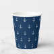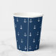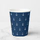 Paper cups featuring a white anchor pattern with an editable background colour (click customise, go to the "Auto Warping, Wrap" layer and change the background colour). They make great paper cups for a beach or nautical theme celebration.