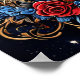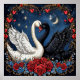 Elegant illustration featuring a white swan and a black swan embracing, surrounded by red and blue roses, golden heart decorations, and a night sky with stars and crescent moon.