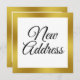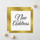 'New Address' appears in black script on the front of this moving announcement. On back you can personalise your card with your change of address with your name, new address, e-mail address and/or cell phone numbers. All text can be edited or deleted.