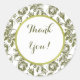 A custom Thank You sticker with script letters on an elegant antique floral pattern of vintage etched roses in white and golds.