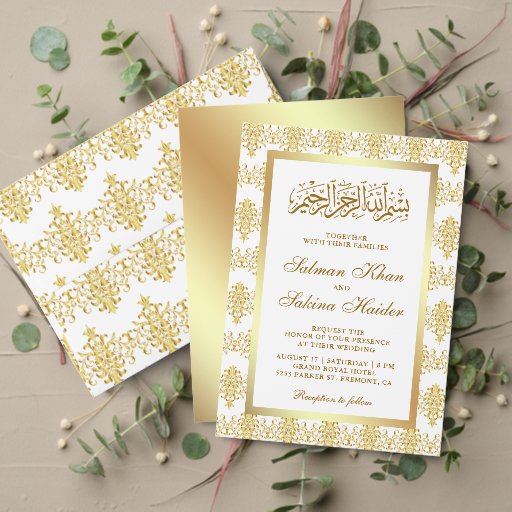 White and Gold Damask Pattern Muslim Wedding Invitation