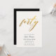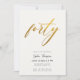 A white and gold, glam, modern, elegant and chic 40th birthday party invitation template featuring the word "forty" covered in gold foil (this is a digital effect), modern calligraphy script and typography in a gold hue, with a black background on the back. A chic, timeless design for a woman on her fiftieth birthday.