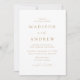 Minimalist, modern wedding invitation featuring your wedding details in gold lettering with calligraphy script accents with a white background. The back of the trendy wedding invitation displays your vertical engagement photo. Designed to coordinate with our Modern Elegance wedding collection.