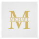 featuring personalised gold monogram in classic serif font style with box of name in the middle of monogram on white background.