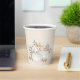 Paper cups with fancy watercolor white pumpkins with accents of faux gold glitter. Surrounded by green leaves and pink wild flowers.