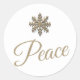 Add a touch of elegance to your holiday mailings and packages with this beautiful round sticker. The clean simple white background is adorned with a brushed gold snowflake at the top, symbolising the serene beauty of the season. Beneath it, the word "Peace" is delicately scripted in a classic script font, capturing the spirit of tranquillity and goodwill. Perfect for adding a heartfelt touch to your festive greetings, these stickers are a charming way to spread joy and warmth this holiday season. Use them to seal envelopes, decorate gift wrap, or adorn holiday favours. Elevate your holiday presentation with this captivating and meaningful design.