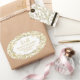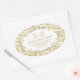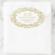 White and metallic gold, elegant vintage ornate frame and floral damasks pattern, save the date oval sticker. Design is available on other products.