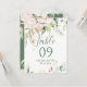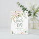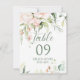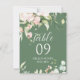 White and pastel pink roses border for a wedding table number—double-sided engagement party with white and olive-green reversible colours.