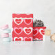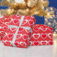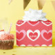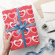 This design displays a pattern of white and pink hearts on a red background and the word "love" in the middle of the white hearts.