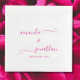 These wonderful elegant party napkins are perfect for weddings, bridal showers, baby showers, birthdays, baptisms, graduations, and more. They offer a minimalist classy design with elegant pink script on a simple white background. Two lines of bright pink coloured text are included but more can be added in the design tool. Personalise them for your event and create a complete look with other coordinating items from our shop. Please note that in order to achieve this elegant script with the accompanying glyphs, you will need to write your names in small letters and make sure you leave the squares before and after the names untouched.